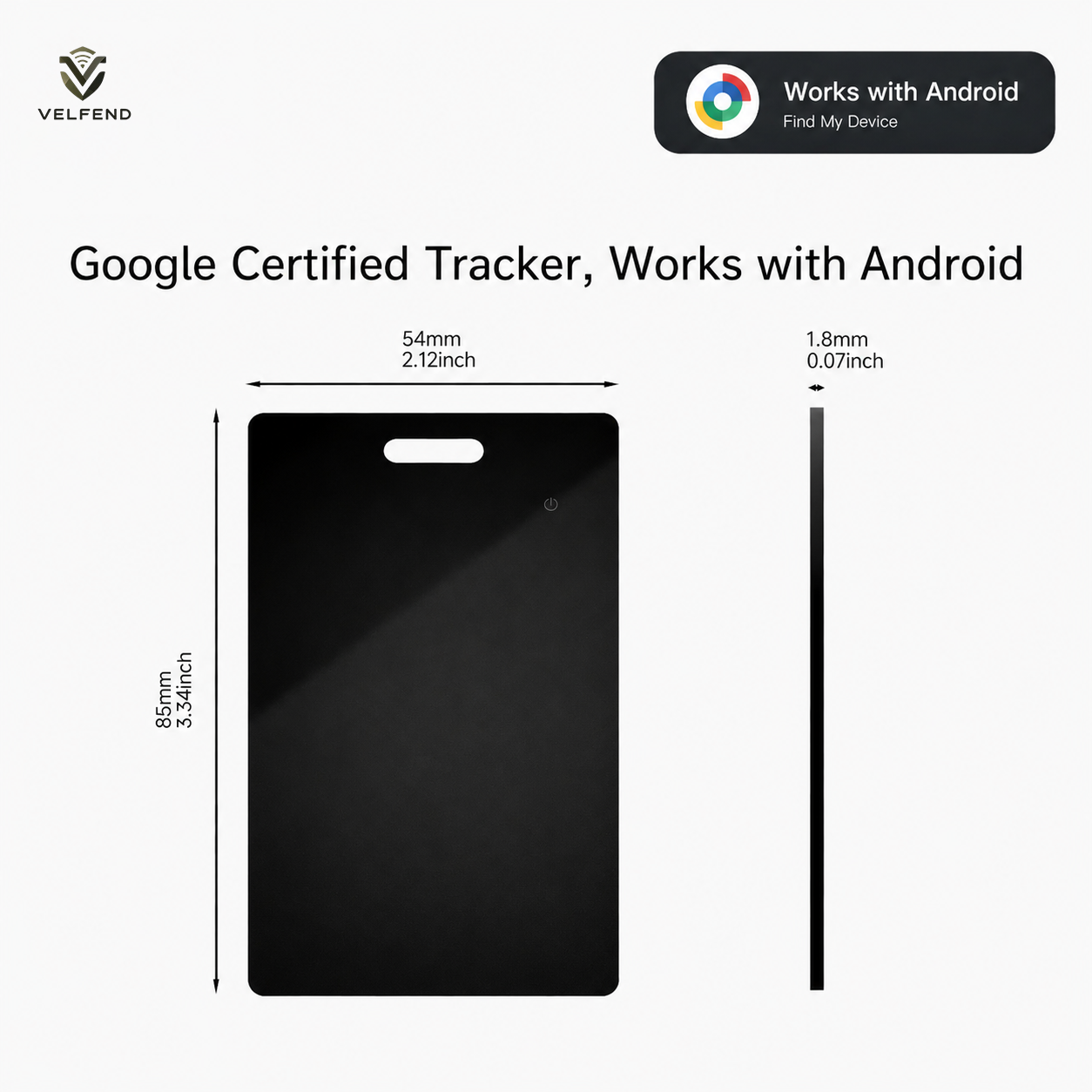 No bulk. No compromise. About the size of a credit card, this tracker fits effortlessly in any Velfend wallet or standard card slot.