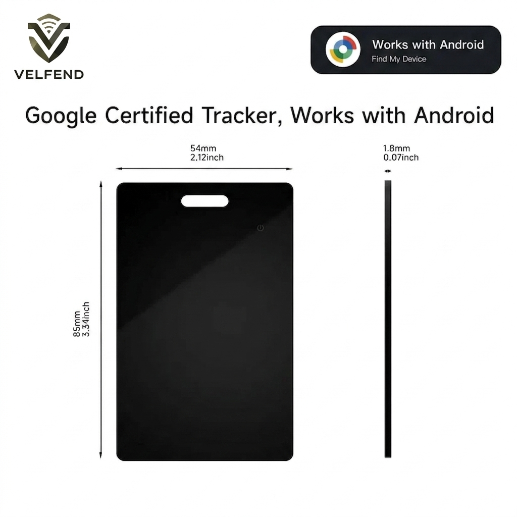 No bulk. No compromise. About the size of a credit card, this tracker fits effortlessly in any Velfend wallet or standard card slot.